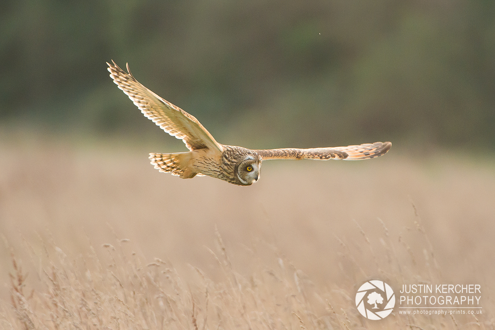 A wild Short Eared Owl hunts for breakfast during an unprecedented break in the heavy overcast skie, allowing the golden light of the rising sun to shine through.