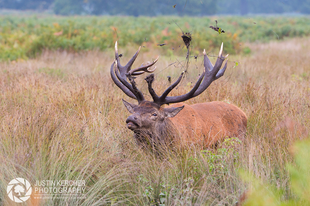 A Red Stag wallows in mud, slighing some into the air to cover its back at Bushy Park.