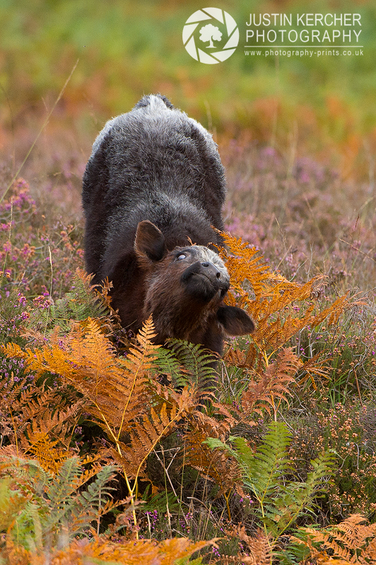 A Young calf enjoys a scratch against the ferns in The New Forest.
