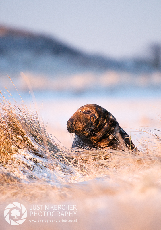 A Grey seal bull lies in the snow covered grasses of the dunes at RAF Donna Nook.